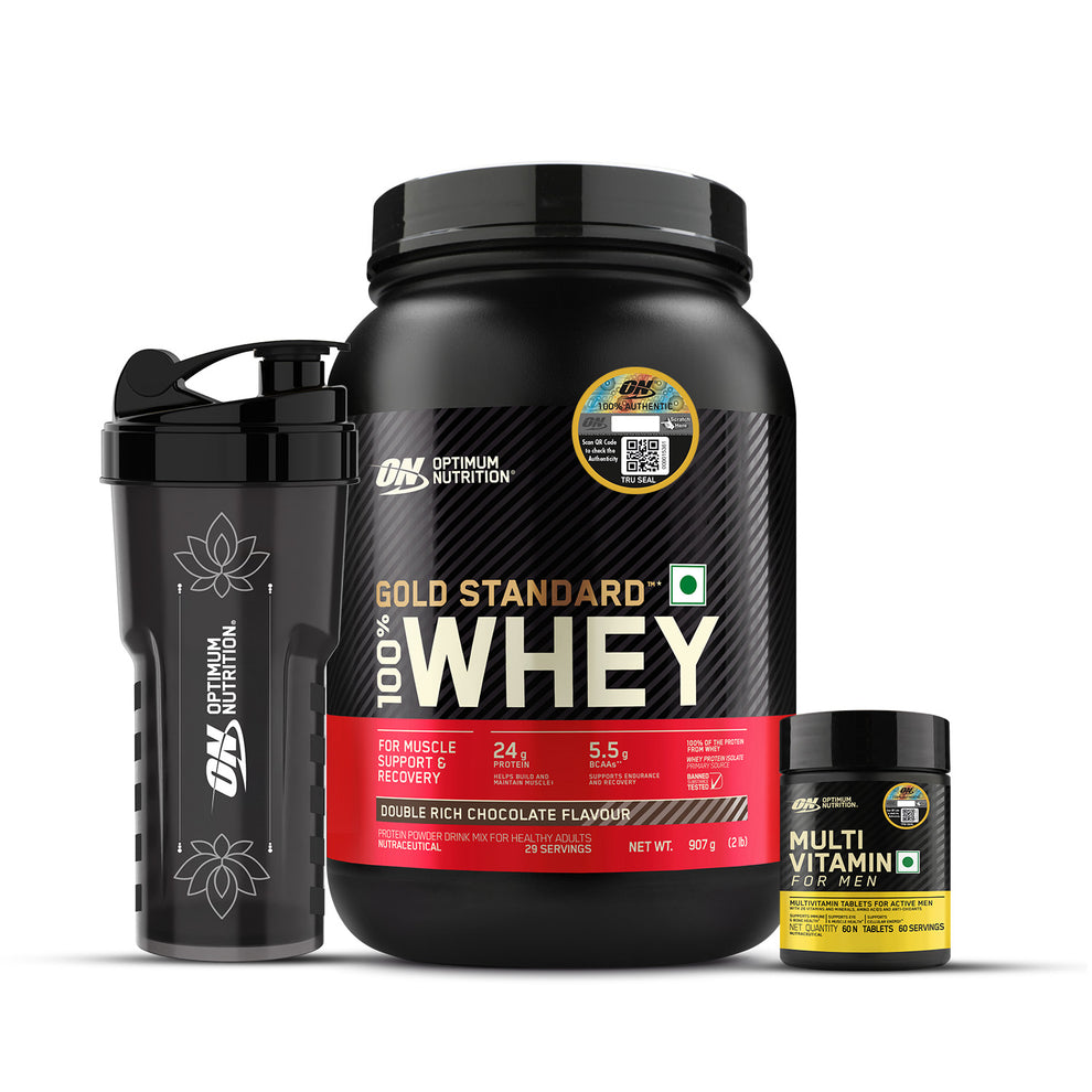 Gold Standard 100% Whey Protein Powder | Double Rich Chocolate | 2 lbs + Multivitamin for MEN- 60 Tablets + FREE Festive Shaker